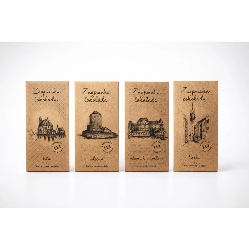 Každá tabulka nabízí lahodnou čokoládu, vloženou do krabičky zdobené ručně malovanou grafikou, která zachycuje nejvýznamnější památky ve Znojmě.