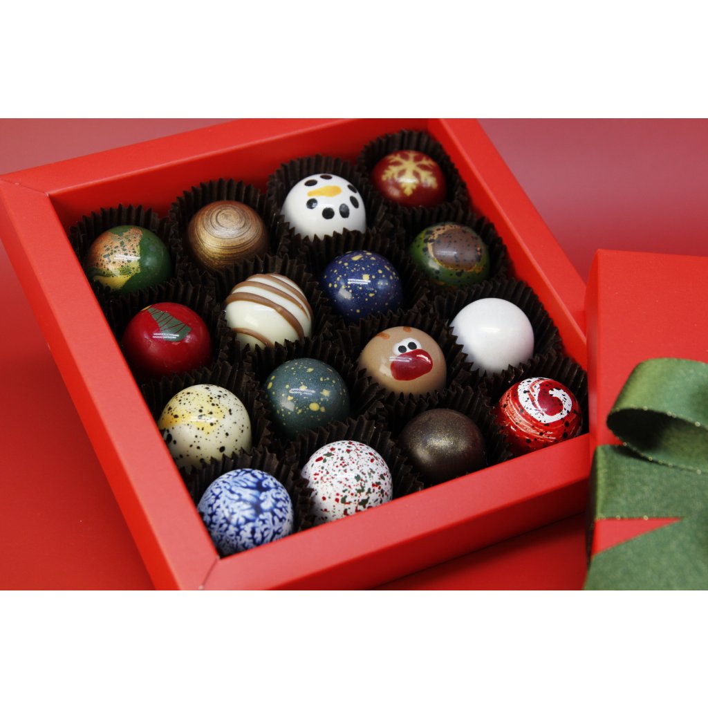 „Sváteční kolekce 16ks“ je naše nejprodávanější vánoční edice vytvořená pro ty, kteří chtějí darovat opravdu něco výjimečného. V červené dárkové krabičce najdeš 16 ručně vyráběných pralinek, každá s jinou chutí, jiným designem a pořádnou porcí zimní atmosféry.