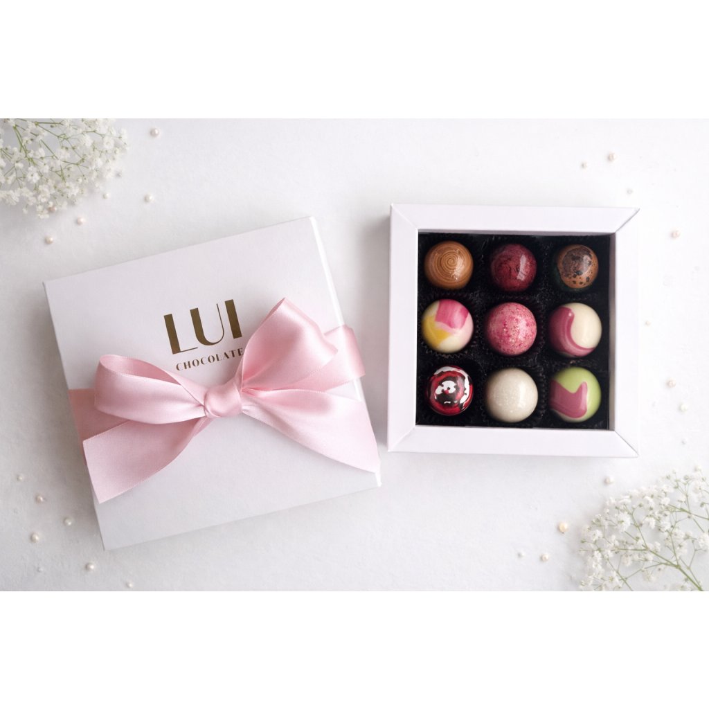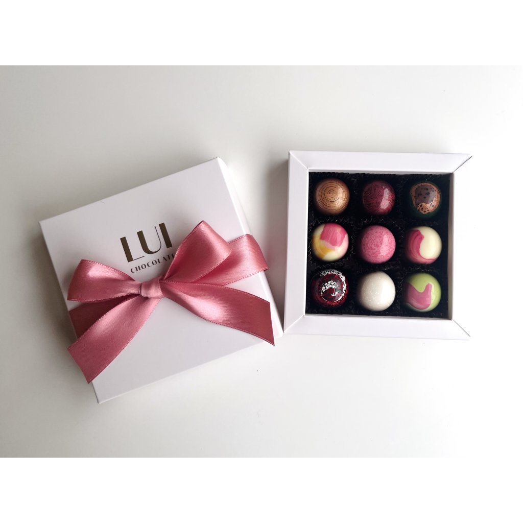 Valentýnská krabička obsahuje 9 ks ručně vyráběných pralinek v náhodném výběru, takže každé ochutnání je malé sladké překvapení.