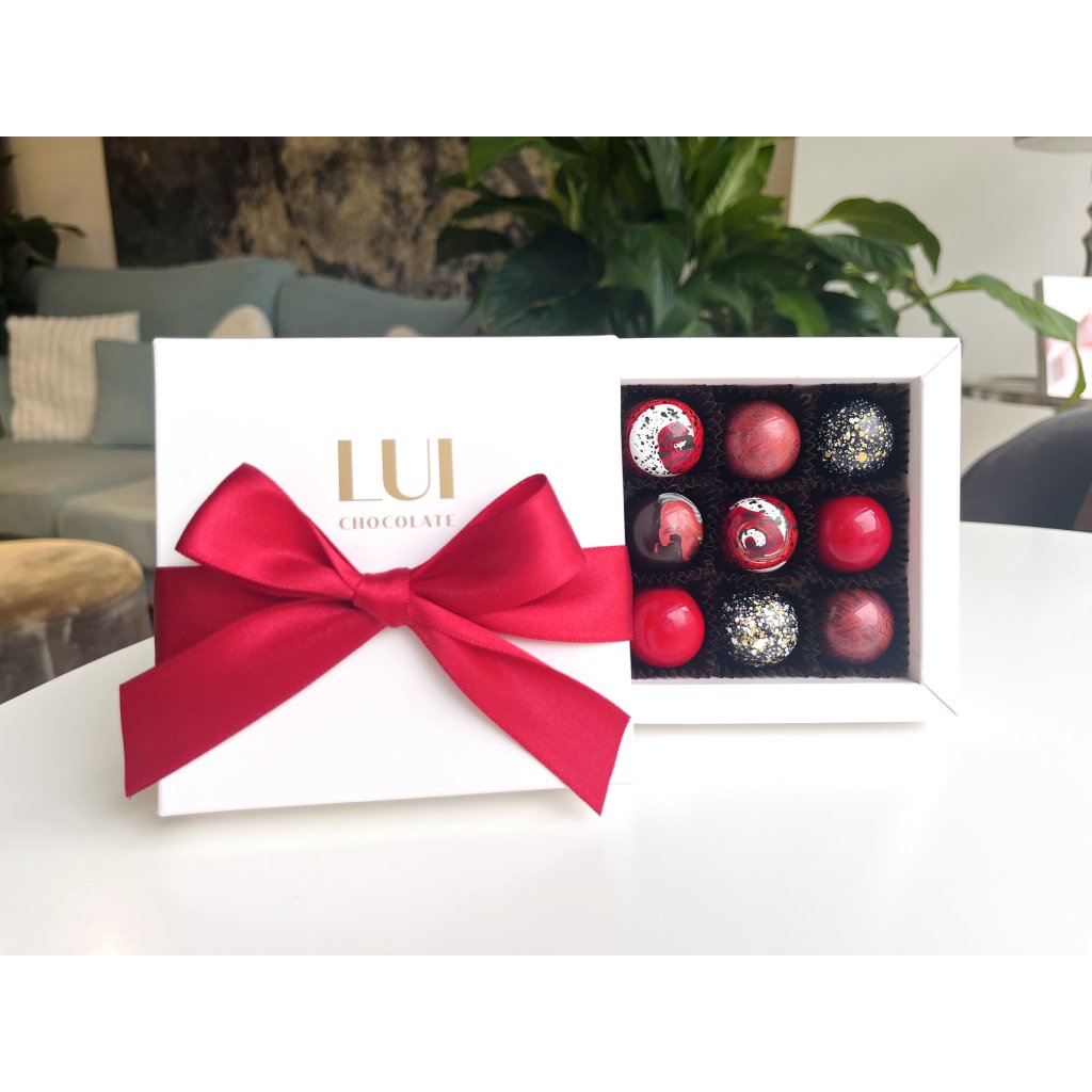 Valentýnská krabička obsahuje 9 ks ručně vyráběných pralinek v náhodném výběru, tentokrát výhradně v lahodné hořké čokoládě 🍫✨